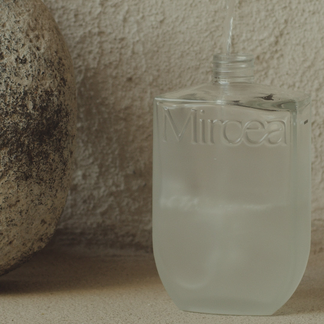 Our soluble crystal formula, rich in essential oils, mixes with water in a refillable glass bottle.